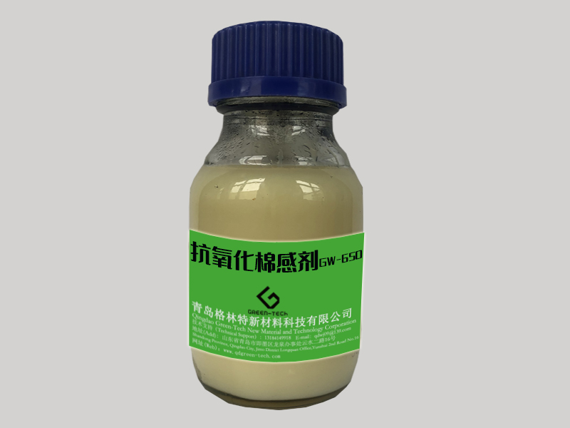 功能特性:抗氧化棉感劑GW-650可減少靛藍(lán)牛仔織物在儲(chǔ)存過(guò)程中受臭氧(O3)及 NOx煙氣褪色所引起的氧化黃變問(wèn)題,提高產(chǎn)品的附加值。手感蓬松,柔軟,親水快。