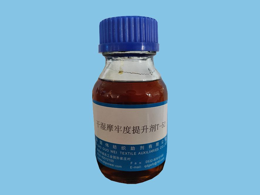 直接、活性、硫化、靛藍(lán)染料在纖維素纖維上染濃深色時濕摩牢度低,特別是大黑、大紅、翠蘭等濕摩擦牢度往往低于3級,而出口歐美的紡織品濕摩擦牢度要求3級以上,故本司開發(fā)了T-52干濕摩提升劑。